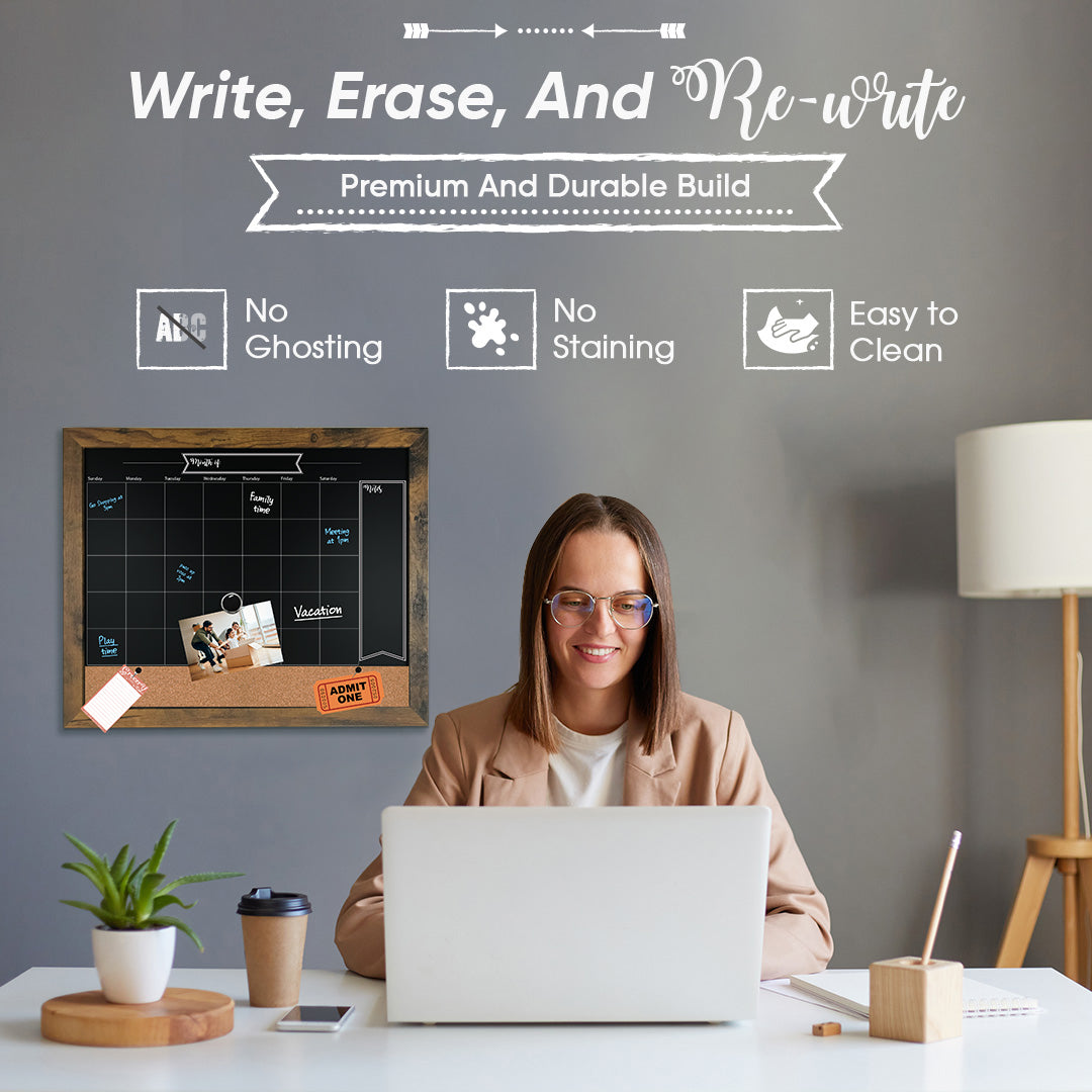 - ✔️ WRITE, ERASE and RE-WRITE - ZERO FUSS, ZERO STAINS: Use the included chalk markers to create your own monthly calendar with important dates and schedules on your large framed magnetic chalkboard calendar without worrying about stains. Your chalk board will never ghost or stain and it will erase every time.