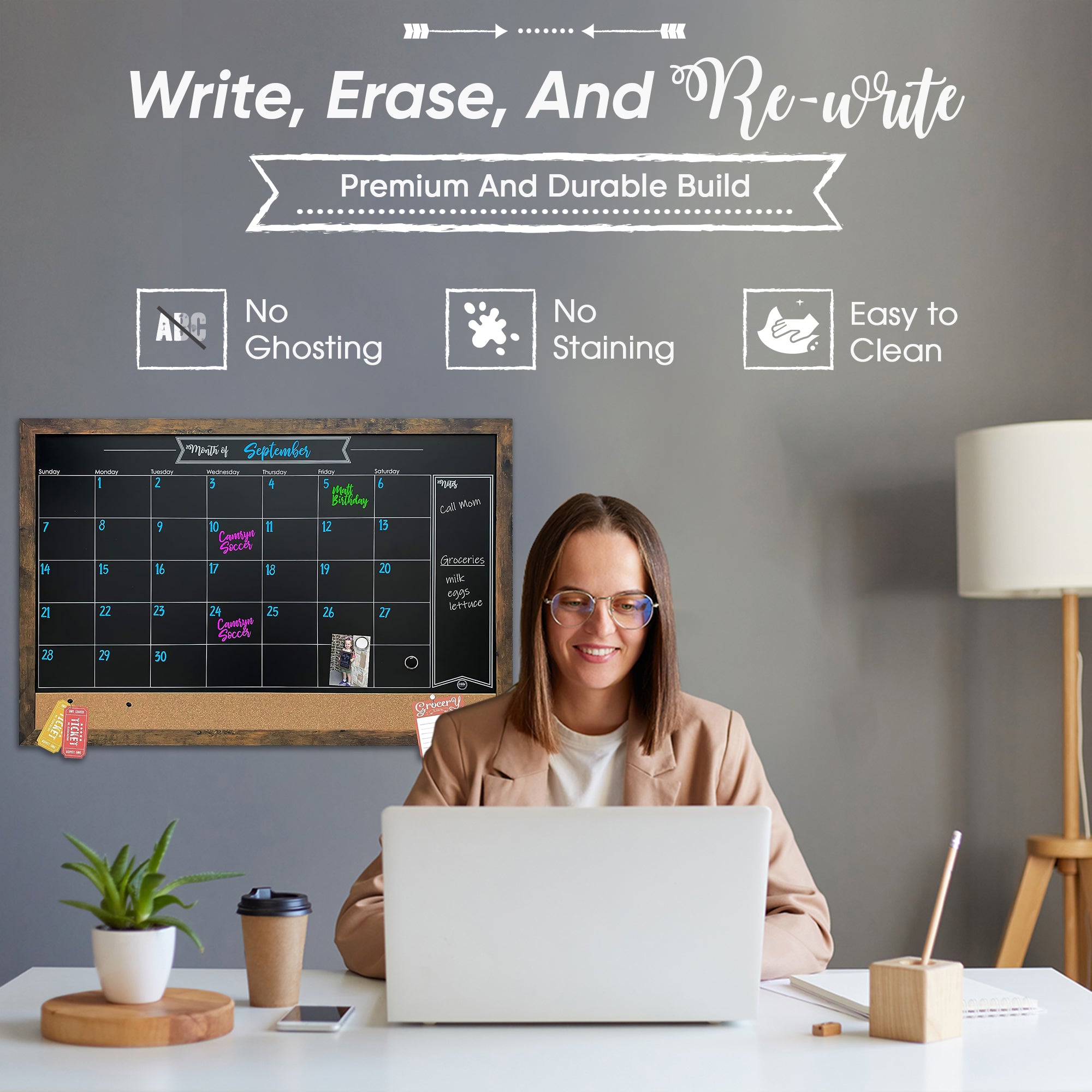 - WRITE, ERASE and RE-WRITE - ZERO FUSS, ZERO STAINS: Create your own monthly calendar with important dates and schedules on your large framed magnetic chalkboard calendar without worrying about stains. Your chalk board will never ghost or stain and it will erase every time.