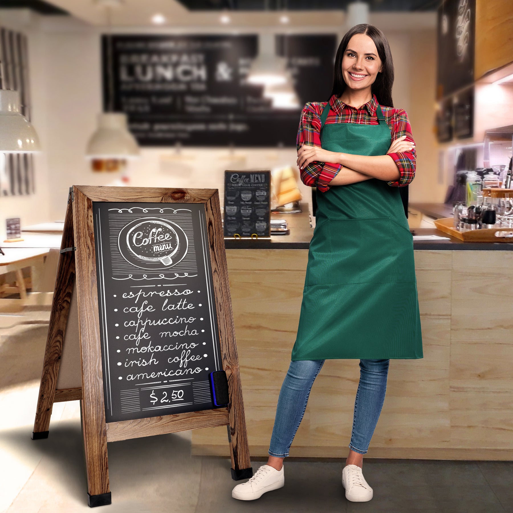 double-sided sandwich board easel is perfect for writing out detailed information about your business or event. The chalkboard surface is high quality and perfect for writing with chalk markers. The A-frame design is sturdy and reliable, and the hinges lock into place, so you don't have to worry about the easel falling over. Plus, the skid-resistant feet keep the easel in place on any surface. The decorative brass corners and joint braces add a touch of style and sophistication. This chalkboard sign with stand comes with everything you need to get started, including 2